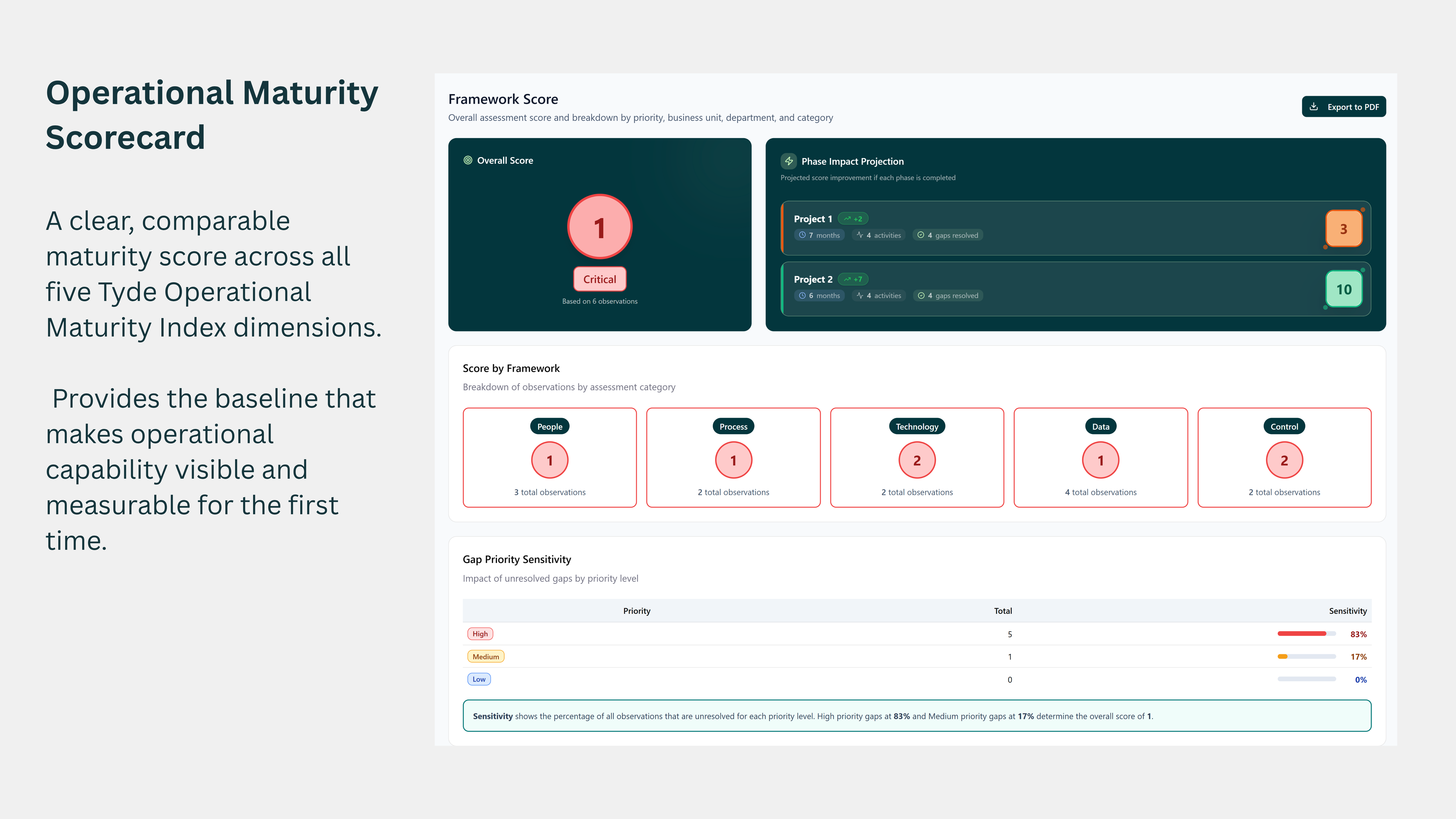 A Tyde Operational Maturity Index score is not a report. It is a commercially defensible, evidence-backed baseline of operational maturity, one that maps directly to enterprise value and creates a structured pathway to improve it.