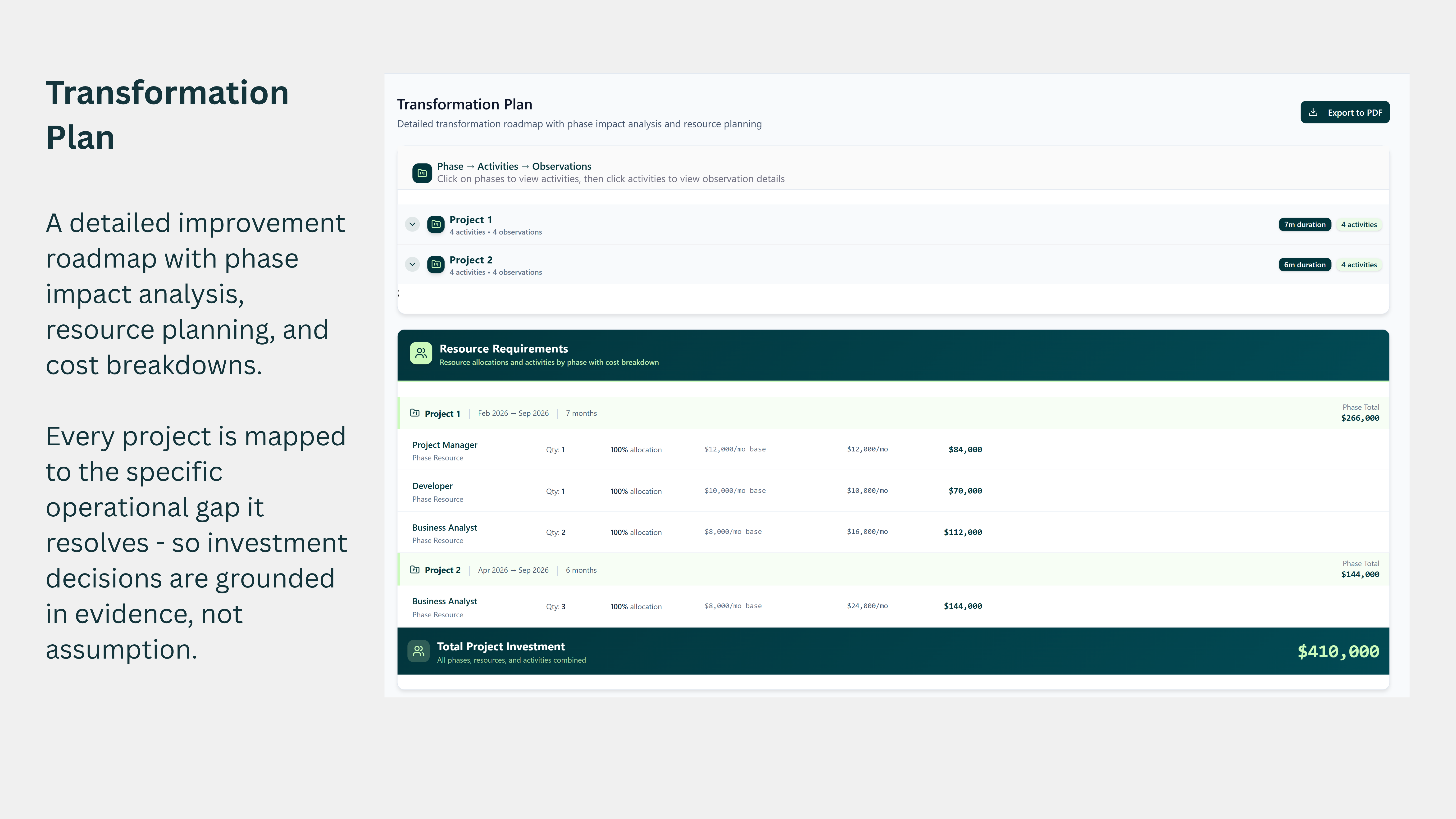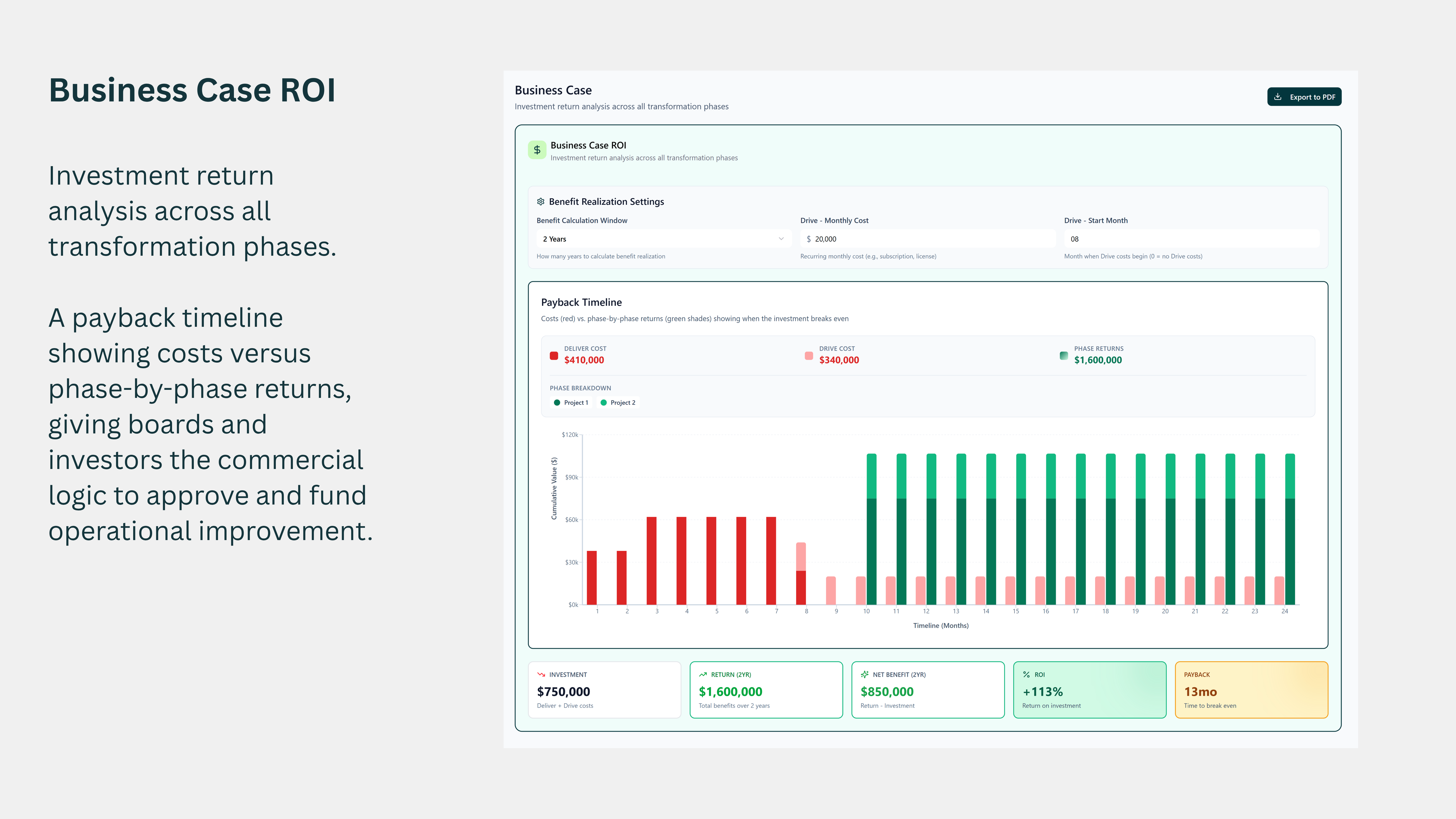 Improvement activities are mapped to identified gaps. Resources, phasing, and return on investment are modelled within the platform. A structured business case is generated automatically - consolidating observations, recommendations, and financial impact into a clear investment logic that leadership teams and investors can act on immediately.